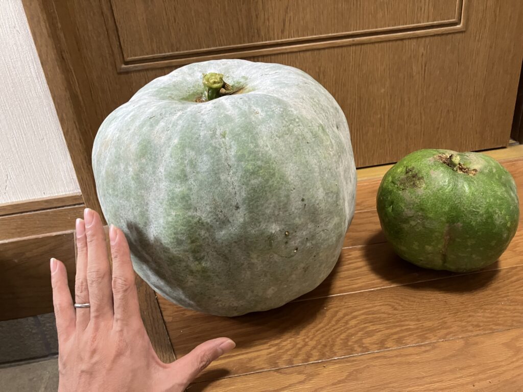 さつまいもの影に隠れて、巨大な冬瓜が育っていました。
