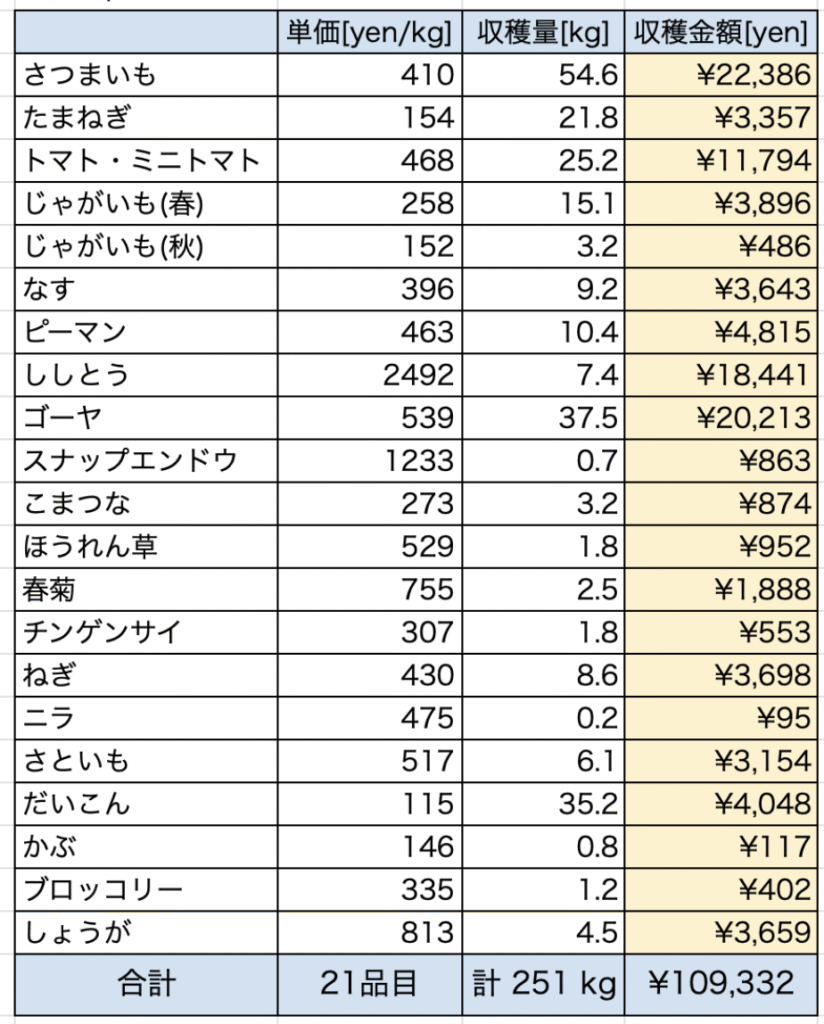 という流れで、野菜の単価[yen/kg]×収穫量[kg]で計算しました。